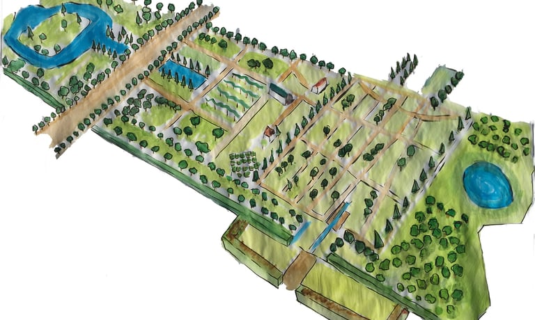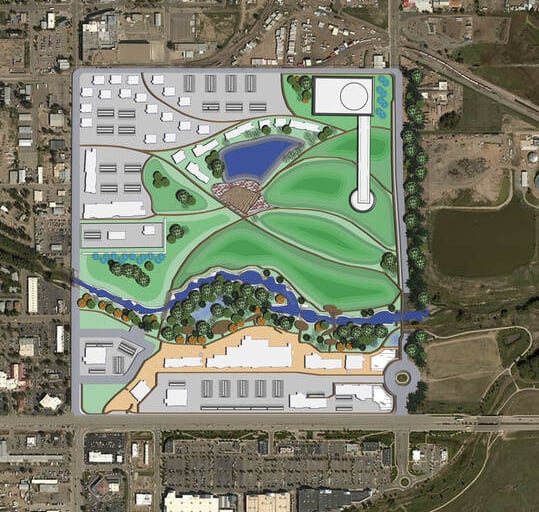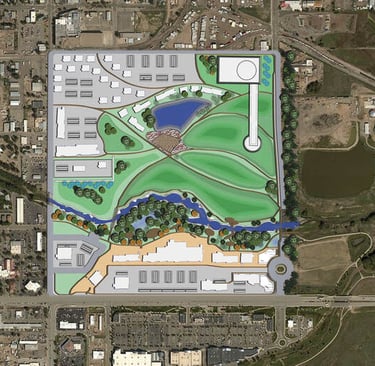 2017 Nature Park Design: Satellite Image, AutoCAD & Photoshop. Task: activate river corridor, brownfield remediation from previous rail tar residual and aggregate mining. Provide riparian buffer area and economic development